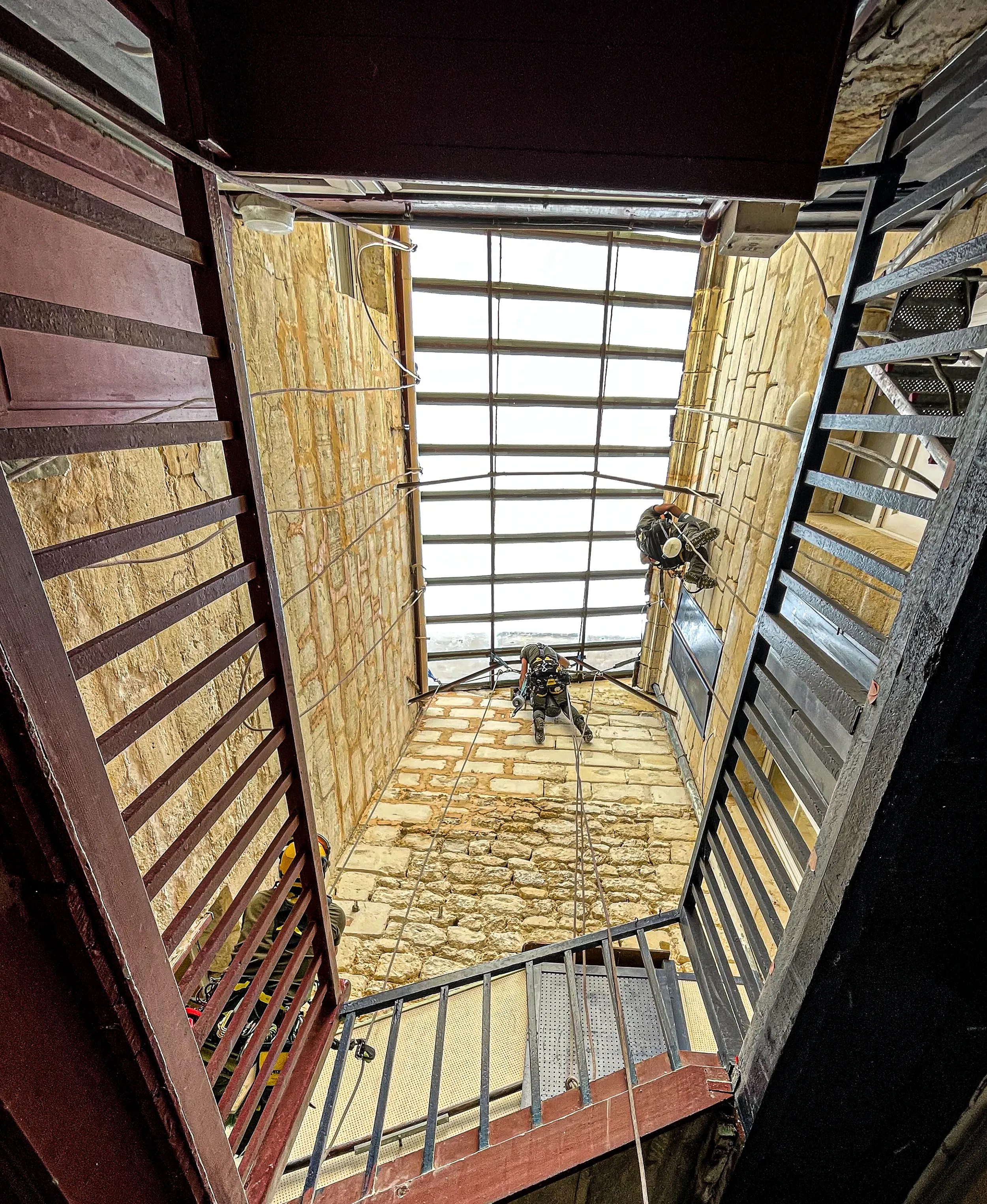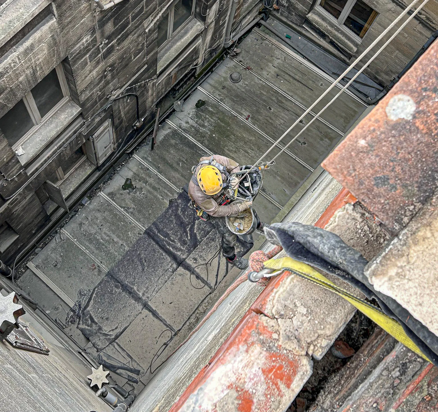Le dernier avantage réside dans la grande variété de métiers que les techniciens cordistes peuvent exercer en suspension. Contrairement aux solutions mécaniques souvent dédiées à une seule tâche, le travail sur corde permet d’enchaîner différents types d’interventions sans changer d’équipement. Un même dispositif permet ainsi de passer instantanément de l’inspection technique (diagnostics de façade) à des travaux de maintenance active, comme la réfection de joints, le nettoyage, la peinture ou la mise en sécurité. Cette capacité à combiner plusieurs savoir-faire techniques en un seul déploiement fait de la corde un outil complet pour la gestion patrimoniale.