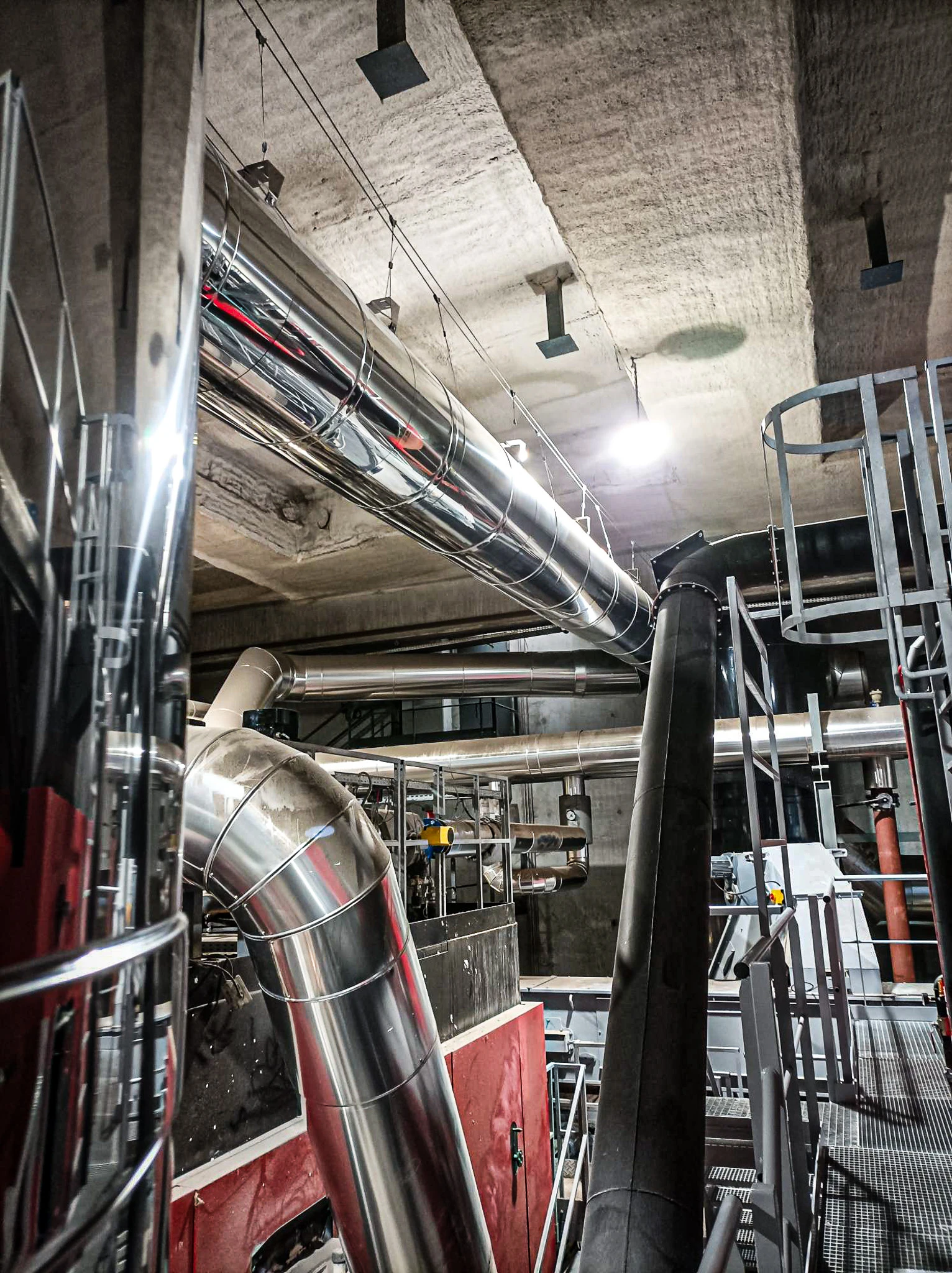 Dans le cadre de la mise en service d’une chaudière bois pour un réseau de chaleur, il a fallu réaliser son raccordement à une cheminée autostable déjà en place, sans interruption prolongée de l’installation existante. Le chantier se situait dans un environnement technique dense, avec de fortes contraintes d’accessibilité et de coactivité.
